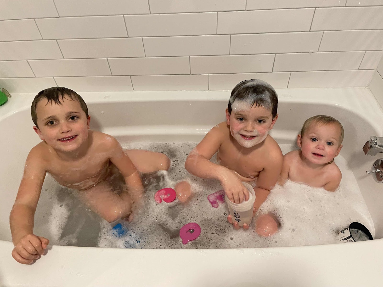 The shampoo spilled the night before and was all over the tub so it made a huge bubble bath. Oops.